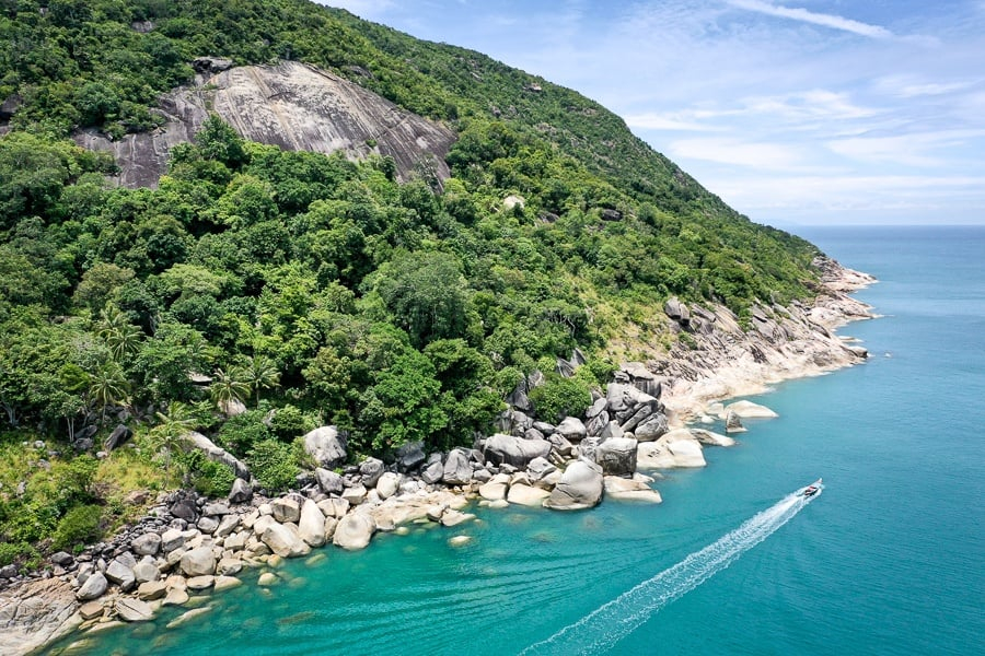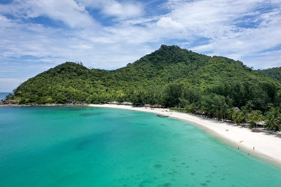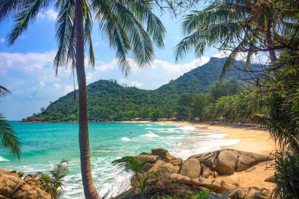 Bottle Beach, also called Haad Khuat, is a true dream beach in the north of Koh Phangan. Here you will find a unique tropical paradise like from a picture book! Fine white sand, turquoise sea, nice local restaurants, countless huge palm trees and deep jun