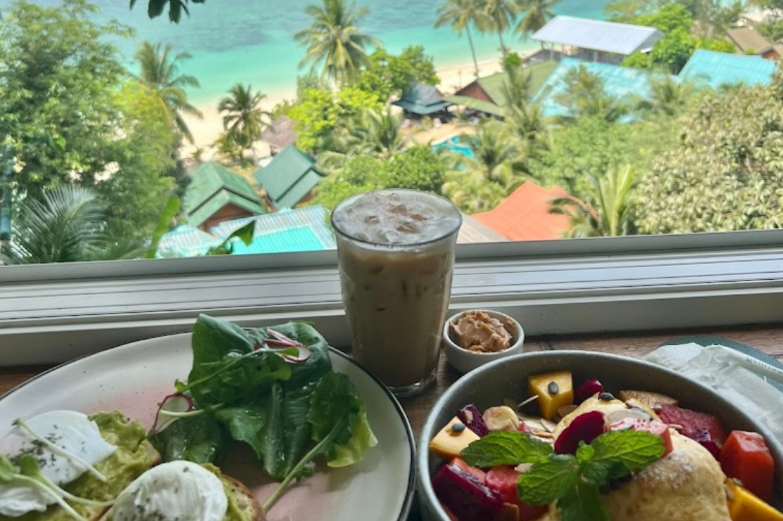 Ciò che rende anche questo caffè speciale è la splendida vista sulla baia di Haad Yao sottostante con la sua vibrante acqua turchese, il bordo roccioso e i dintorni di palme e giungla.